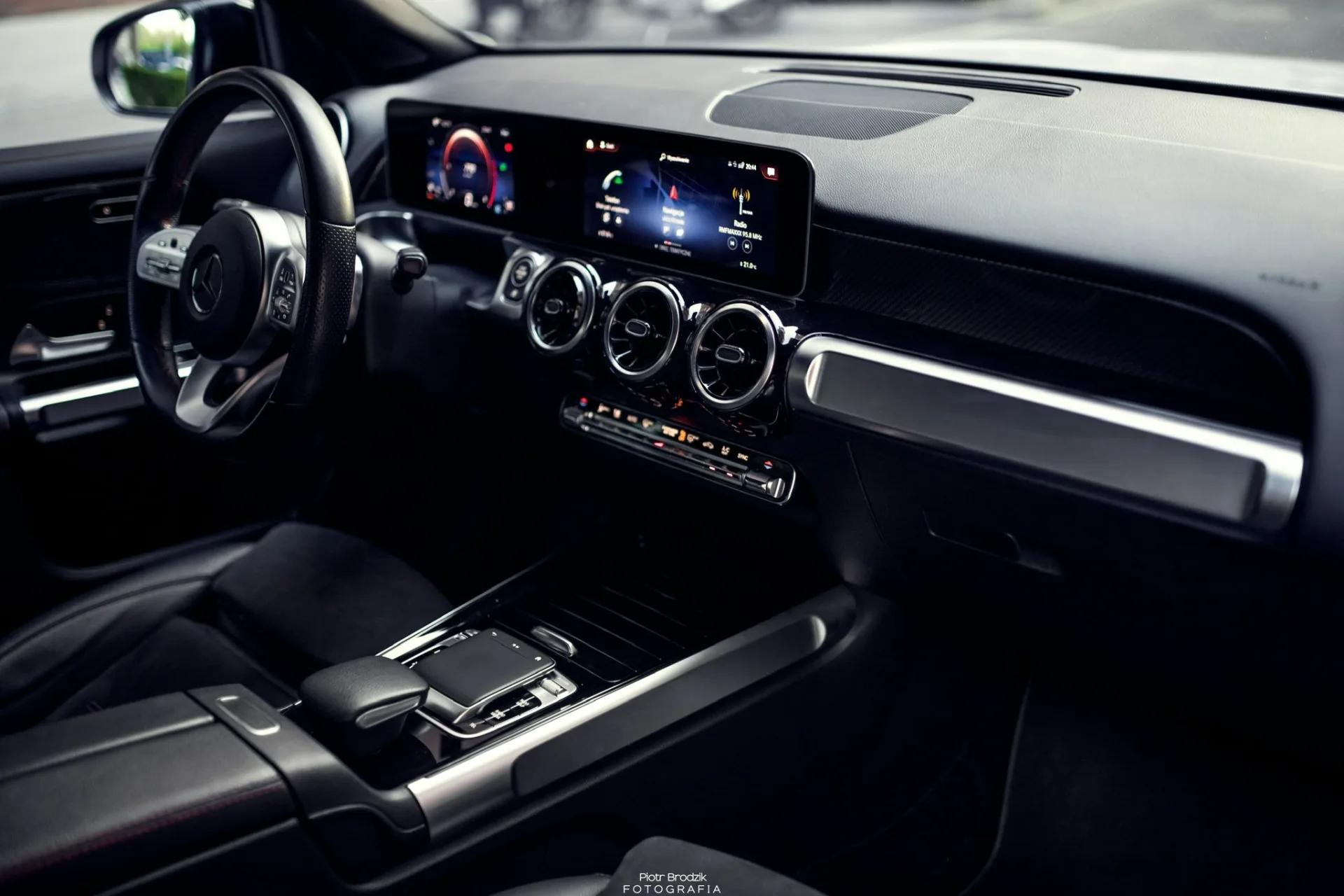 Wnętrze zaprojektowane z dbałością o każdy detal – czarna podsufitka, kubełkowe fotele wykończone skórą i alcantarą z czerwonymi przeszyciami, sportowa kierownica AMG i w pełni cyfrowy kokpit tworzą przestrzeń, w której wszystko podporządkowane jest kierowcy. To kabina, w której komfort spotyka się z technologią – z charakterystycznym dla marki Mercedes-Benz poczuciem klasy i spójności.